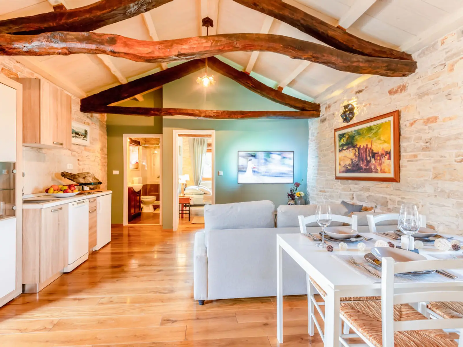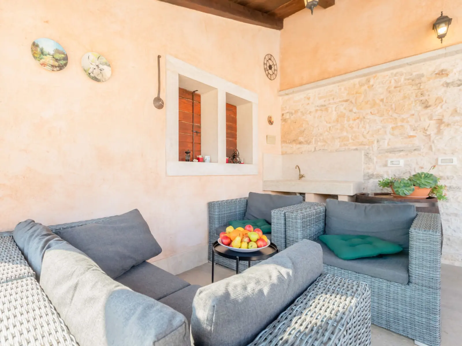 The living room opens directly onto a spacious, covered terrace, where you can enjoy Istrian evenings: