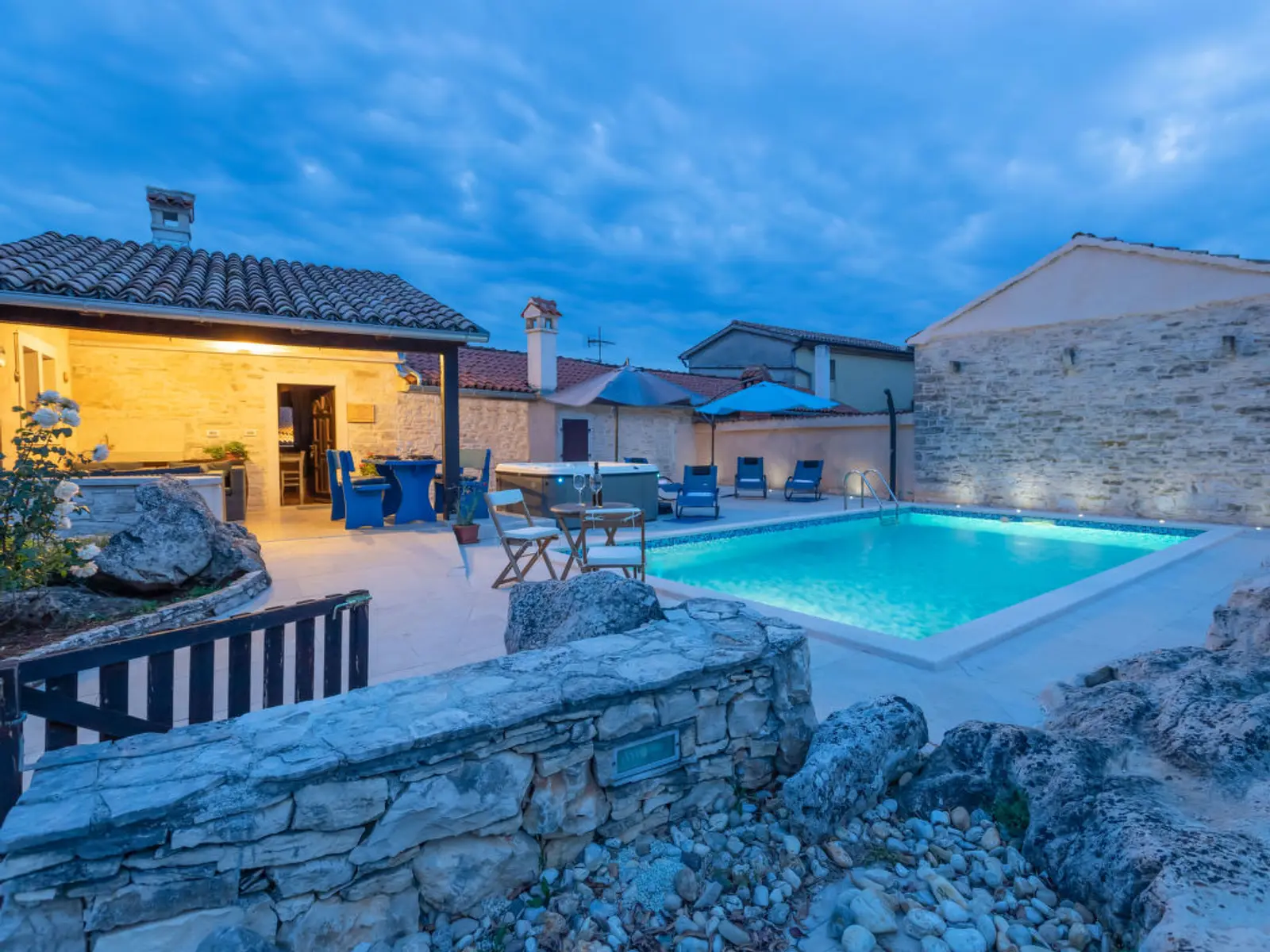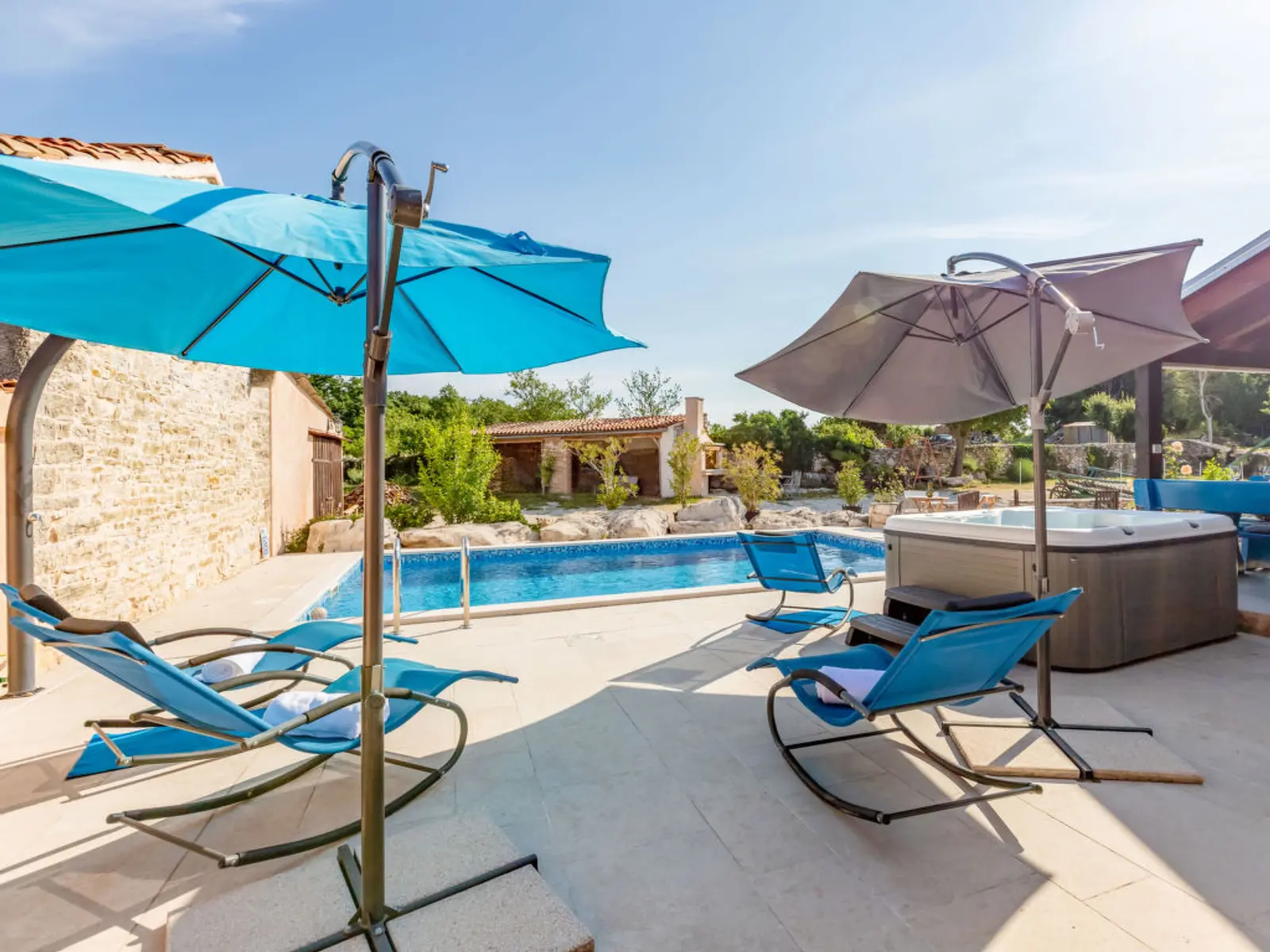 Yard: The apartment offers its own, **fenced yard of 400 m²** with a rectangular **pool (8 x 4 m)**, a whirlpool, and an outdoor shower. Enjoy all-day sun with large parasols and prepare perfect dinners using your **own** traditional grill and **electric grill** for tasty summer meals.